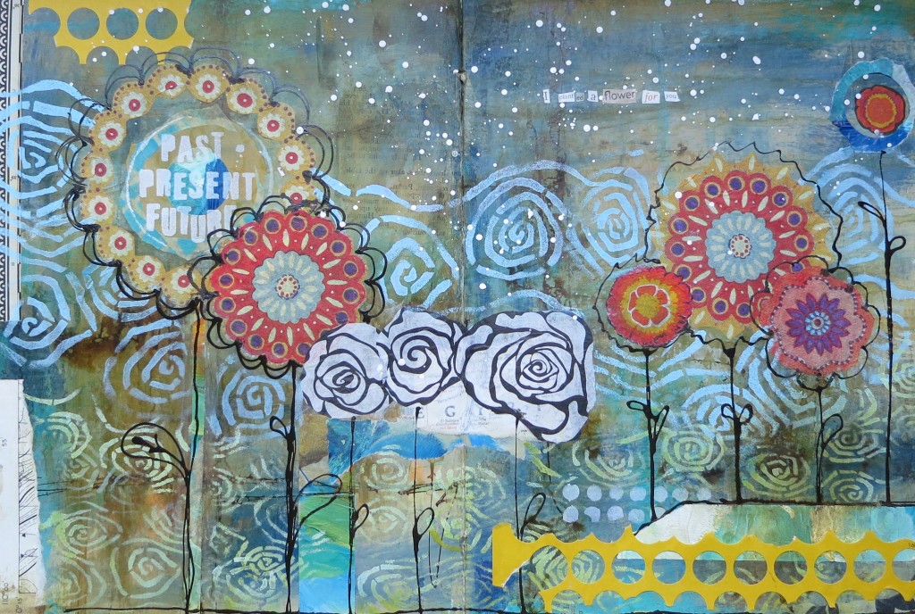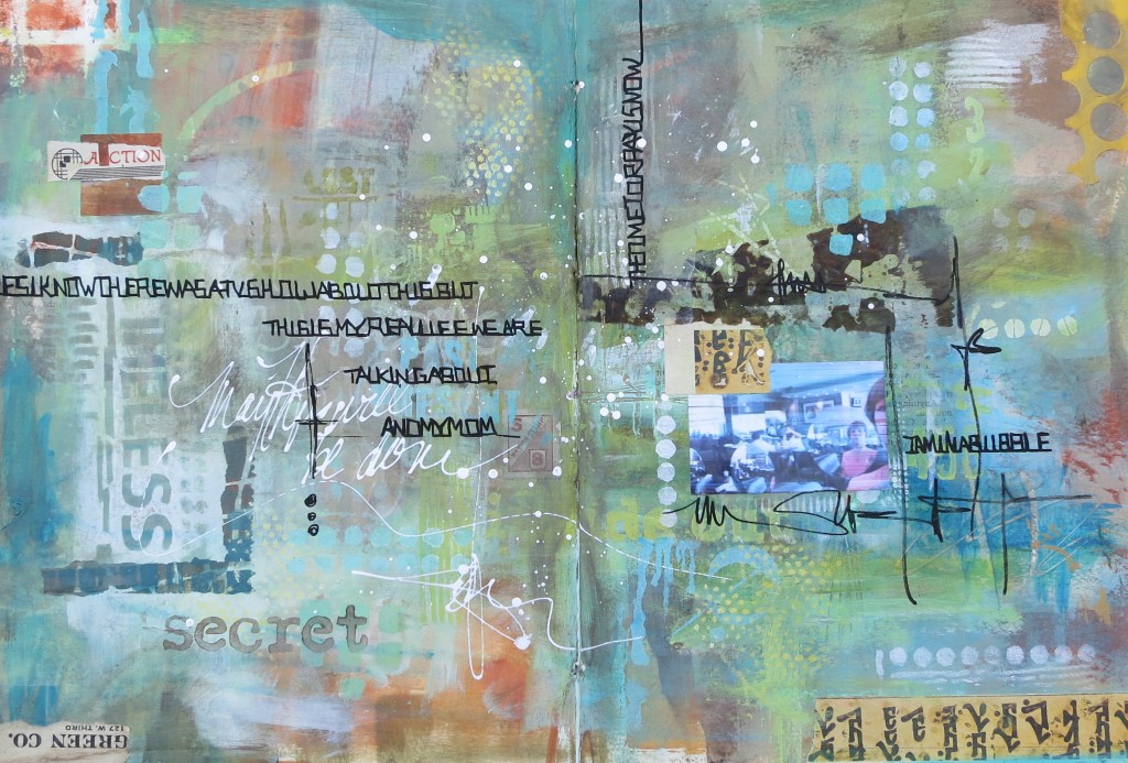 It was years before I found my own true voice as an artist and the courage to express my deepest and most raw beliefs took even longer. The journal spreads I have included were made when struggling with my feelings about my mother’s cancer.